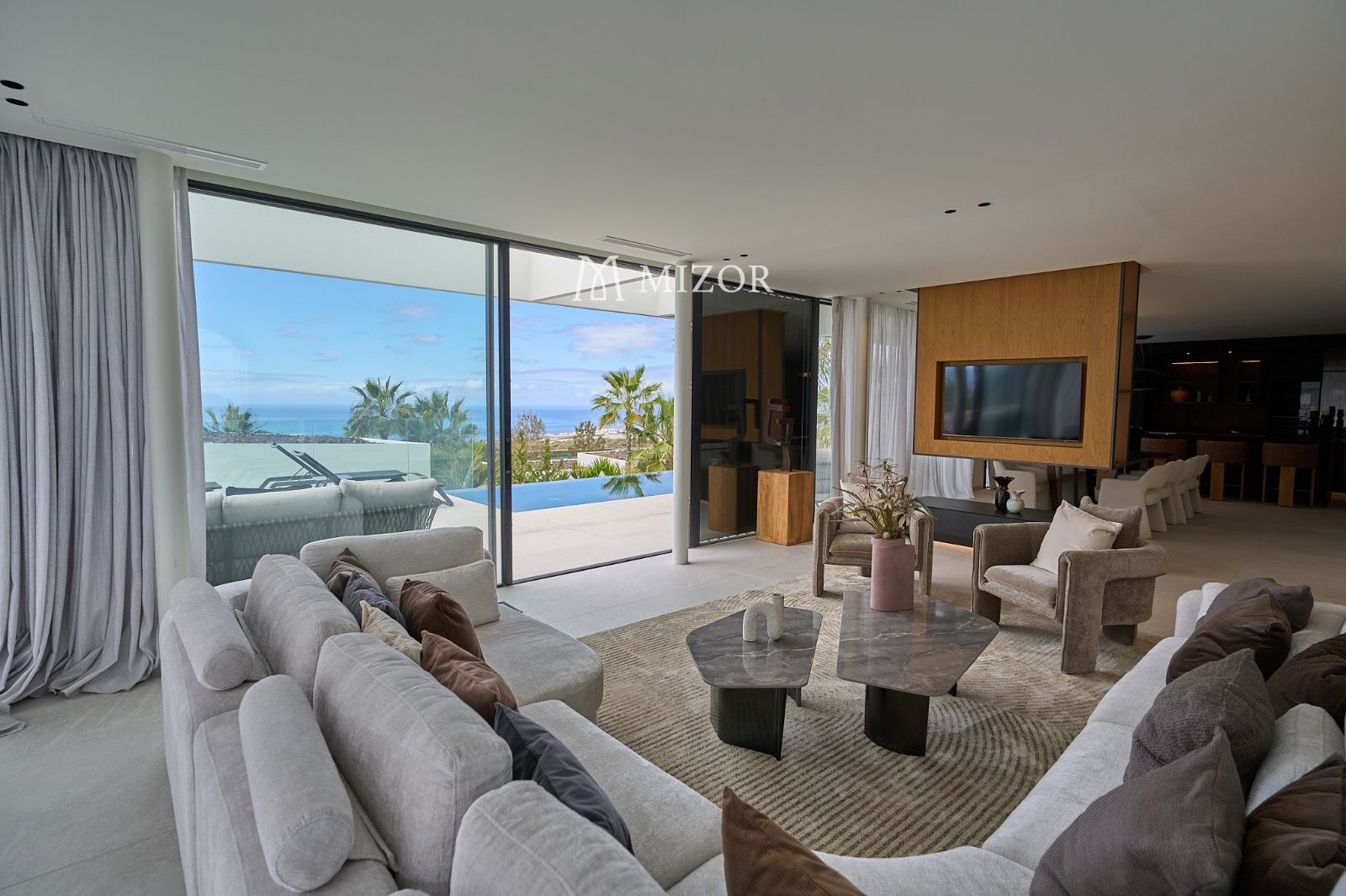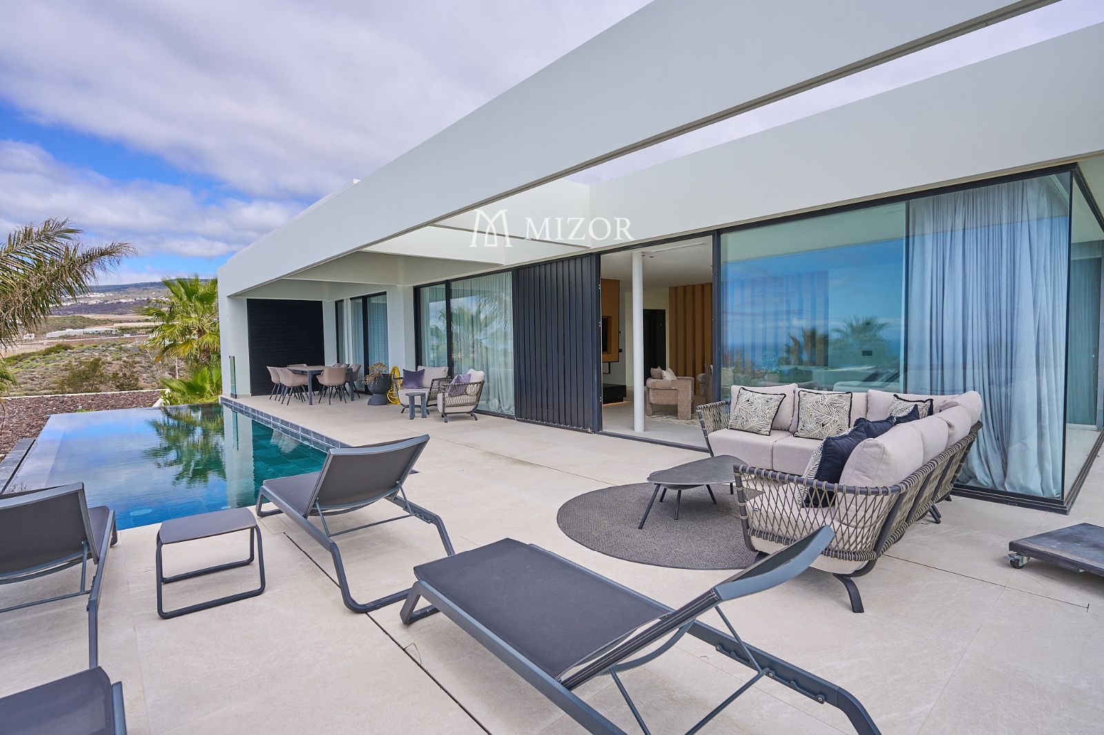El exterior está pensado para disfrutar del clima privilegiado de Tenerife durante todo el año. La terraza principal alberga una impresionante piscina infinita, zona de barbacoa y amplios espacios de descanso desde donde contemplar las vistas al océano Atlántico y al paisaje del resort.